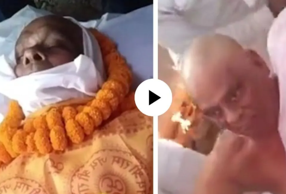 -74-year-old Mohan Lal staged his own funeral in Gaya, lying on a bier in a white shroud.