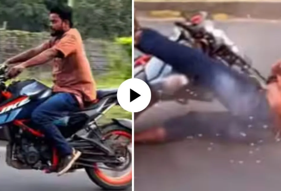 व्हायरल होत असलेल्या व्हिडिओमध्ये तुम्ही पाहू शकता की एक तरुण हायवेवर वेगाने स्पोर्ट्स बाईक पळवत आहे. याचा व्हिडिओ त्याचा मित्राने रेकॉर्ड केला आहे. तुम्ही पाहू शकता की, तरुण वेगाने बाईक पळवत असतो. याच वेळी अचानक तो बाईवर उभे राहून गाडी चालवायला लगतो. नंतर तो अचानक बाईकचा वेग वाढवतो आणि बाईक हवेत उचलतो अन् इथेच खेळ संपतो. तरुण बाईक हवेत उचलून घेतो पण काही अंतरावर जाताच त्याचा तोल जातो आणि तरुण बाईकवरुन खाली पडतो. तरुण इतक्या जोरात आदळतो की पाहून तुमच्याही अंगावर शहारे येतील. व्हिडिओमध्ये दिसत आहे की बाईकपण रस्त्यावर घासली गेली आहे.