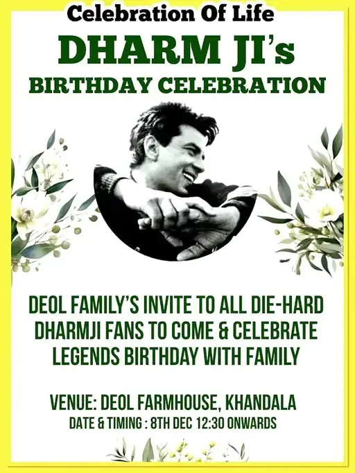 बॉलिवूडचे दिग्गज आणि लोकप्रिय अभिनेते धर्मेंद्र यांनी 24 नोव्हेंबर रोजी निधन झालं. वयाच्या 89 व्या वर्षी धर्मेंद्र यांचं निधन झालं. सांगायचं झालं तर, कुटुंबिय धर्मेंद्र यांचा 90 वा वाढदिवस मोठ्या थाटात साजरा करणार होते. पण त्याआधी त्यांचं निधन झालं. आता धर्मेंद्र यांच्या 90 व्या वाढदिवशी म्हणजे 8 डिसेंबर रोजी कुटुंबियांनी एका कार्यक्रमाचं आयोजन केलं आहे. देओल कुटुंब आता त्यांचा वाढदिवस खंडाळा येथील त्यांच्या फार्महाऊसवर साजरा करेल. यावेळी धर्मेंद्र यांचे चाहतेही त्यांना श्रद्धांजली वाहू शकतील.