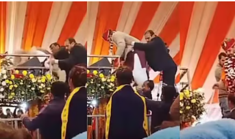 उत्तर प्रदेशमधील भाजपचे नेते आणि माजी खासदार ब्रिजभूषण शरण सिंह (climbing) स्टेजवरच तोंडावर पडल्याचा व्हिडिओ सोशल मीडियावर व्हायरल होतोय. हा व्हिडिओ राष्ट्रकथा या कार्यक्रमावेळचा असल्याचे समोर आलेय. भाजप नेते ब्रिजभूष हे राष्ट्रकथा कार्यक्रमासाठी स्टेजवर जात होते. त्यांच्यासोबत काही इतर नेतेही उपस्थित होते. त्यावेळी अचानक त्यांचा तोल गेला अन् ते जमिनीवर पडल्याचे व्हिडिओत दिसतेय. या दुर्घटनेत सुदैवाने त्यांना कोणतीही दुखापत झाली नाही. तोल गेल्यामुळे पडलेले बृजभूषण यांनी स्वत:ला सावरले अन् हसत हसत उभे राहिले. आजूबाजूच्या लोकांनीही त्यांना उठण्यासाठी मदत केली.